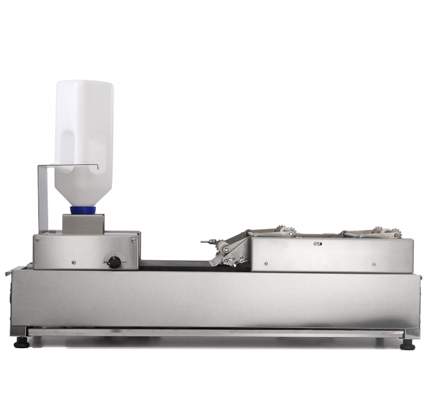 Все процессы автоматизированы - формовка, переворот, съём блина в аккуратную стопку. Автодолив теста в ванночку осуществляется с помощью съёмной полки-держателя и банки с тестом. Регулировка зазора между кареткой и жарочной поверхностью позволяет изготавливать блины разной массы из теста разной плотности (40-60 г).