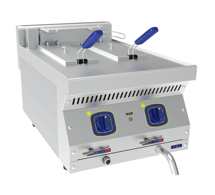 Все регуляторы и функциональные элементы расположены на передней панели. Оснащены двумя термостатами: регулятор температуры и аварийный, который блокирует включение нагревательных элементов при достижении температуры +190°C. Фритюрницы легки в эксплуатации и санитарно-гигиенической очистке.