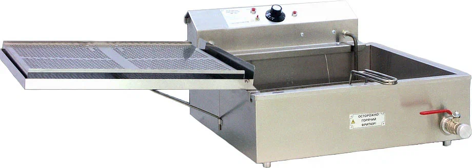 К жарочной ванне, имеющей кран для слива остывшего фритюра, при помощи распорки присоединяется откидная крышка-полка, которая является крышкой при неработающей фритюрнице, а при работе на нее ставится решетка с готовыми пончиками.