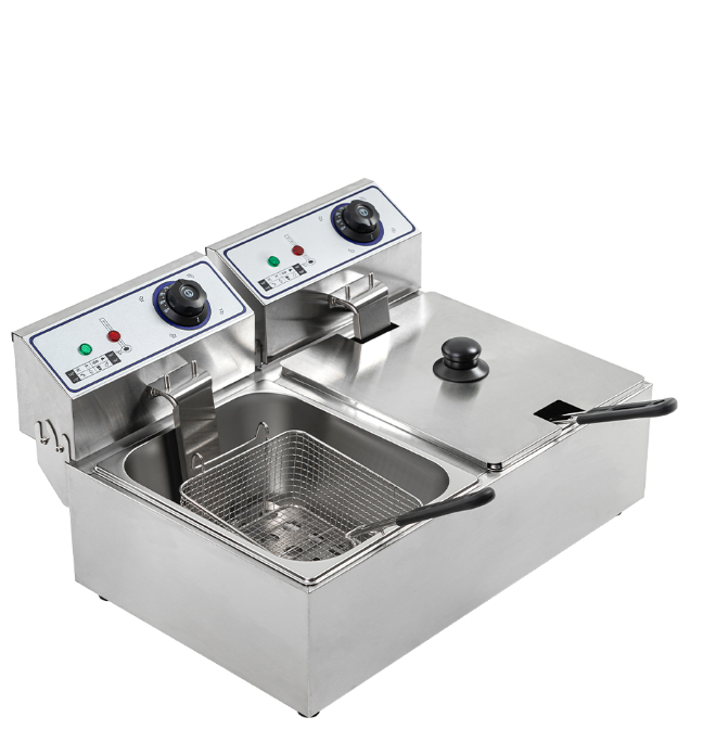Продукты, погруженные в горячий фритюр, моментально покрываются хрустящей корочкой, которая защищает их от пересыхания и поглощения излишнего жира. Для усиления эффекта используются разнообразные панировки и кляры. Настольная электрофритюрница оснащена двумя съемными чашами большого объема (6 л) из нержавеющей стали и двумя корзинами, в каждую из которых можно загрузить до 1.2 кг продукта. Перфорированное фальш-дно защищает открытый ТЭН от контакта с корзиной.