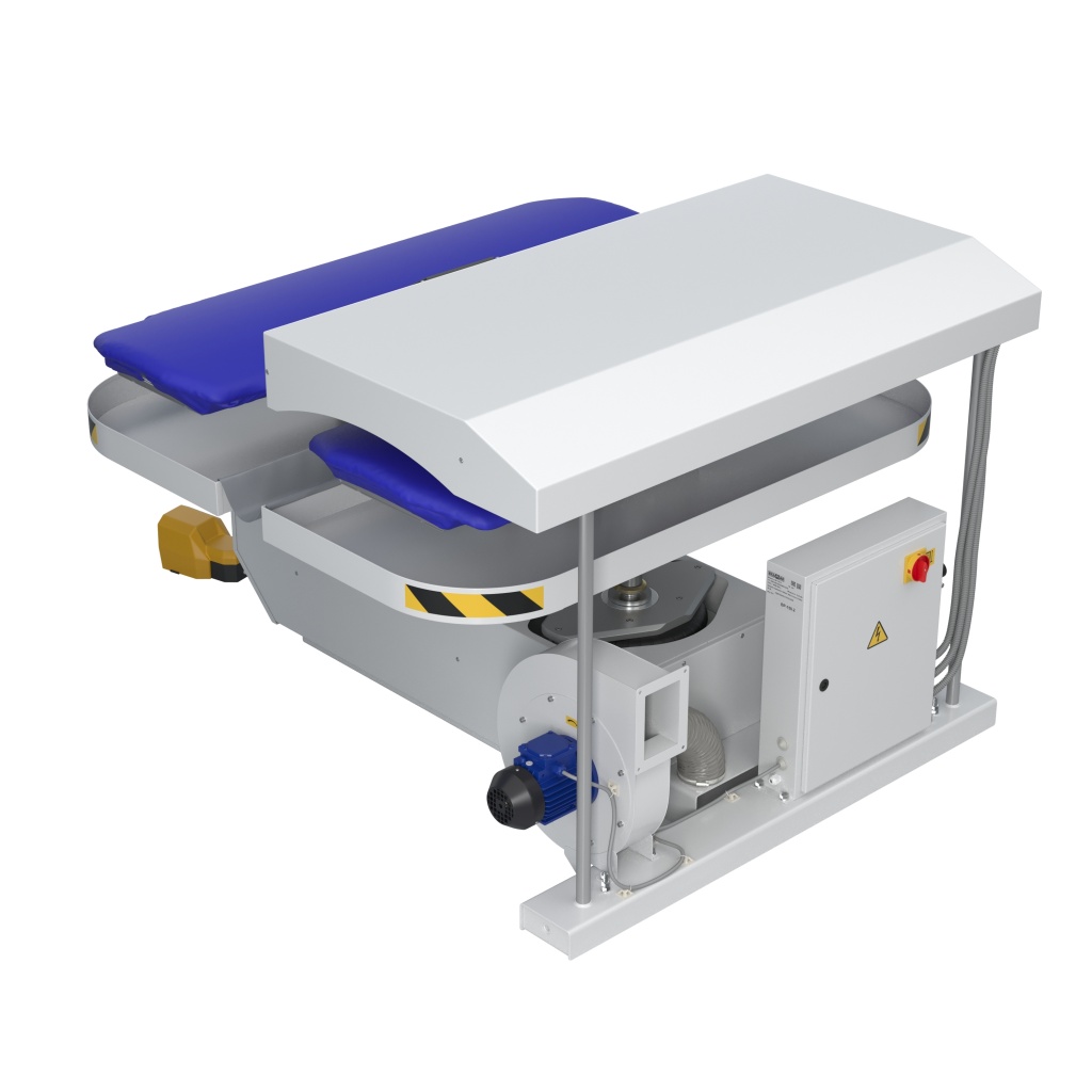Промышленные гладильные прессы карусельного типа ВР предназначены для глажения прямого и фасонного белья. Принцип глажения состоит в поочередном прижиме гладильных столов с уложенным на них бельем к нагретой верхней гладильной плите, пока один стол прижат - происходит процесс глажения, в это время на втором столе оператор раскладывает другое белье. По окончании глажения первый стол опускается, как только оператор нажимает педаль - столы меняются местами. Процесс глажения повторяется для второго стола. Выглаженное белье заменяется новым, и цикл повторяется.