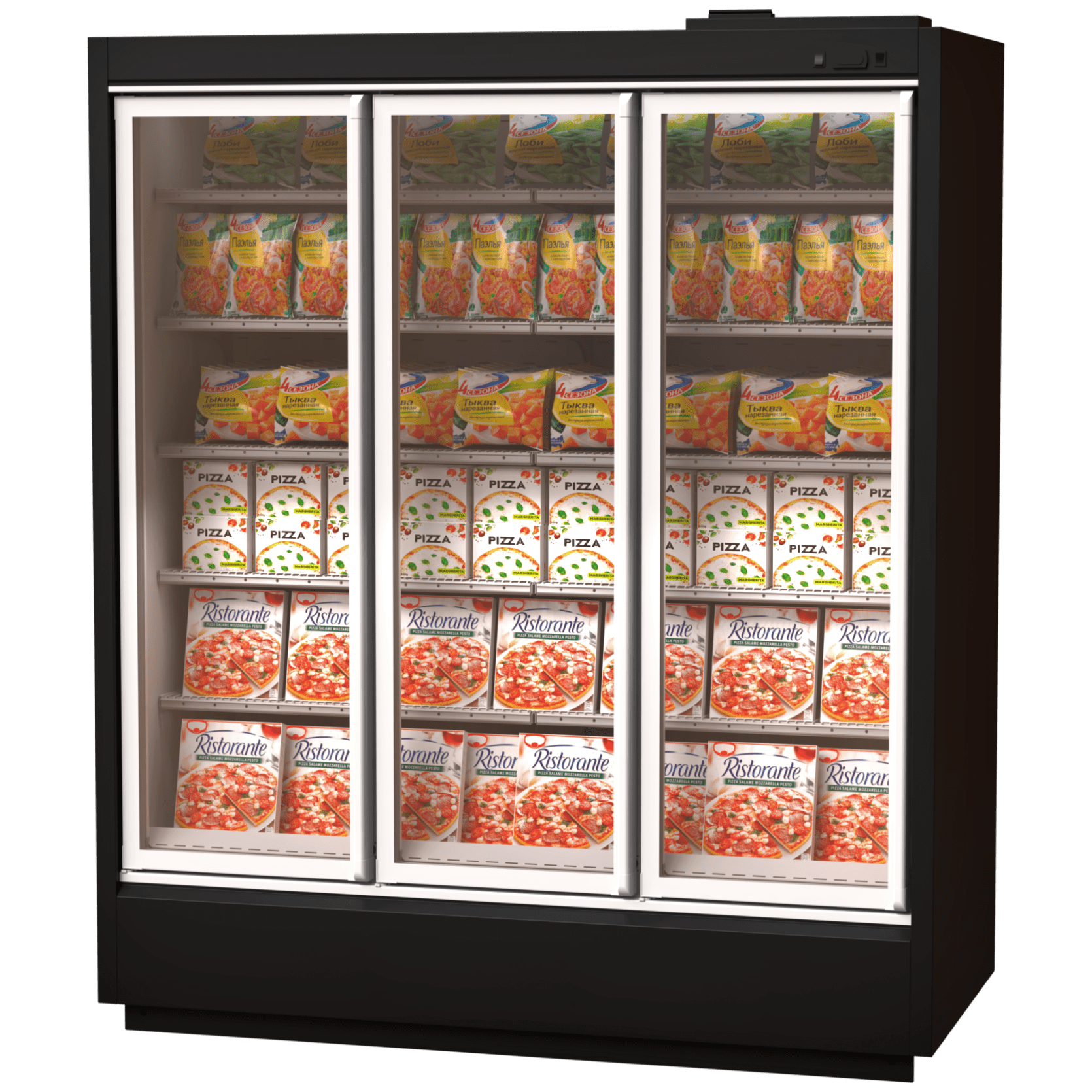 Низкотемпературная горка с выносным агрегатом ЕНИСЕЙ 1875 имеет стеклянные распашные двери, подсветку и двухпозиционные ценникодержатели, применяется в торговле и общепите для демонстрации, хранения и продажи замороженных продуктов питания.