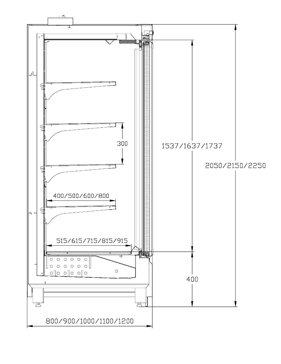 - Полки с возможностью регулировки высоты — 2 ряда 400 мм, 2 ряда 500 мм