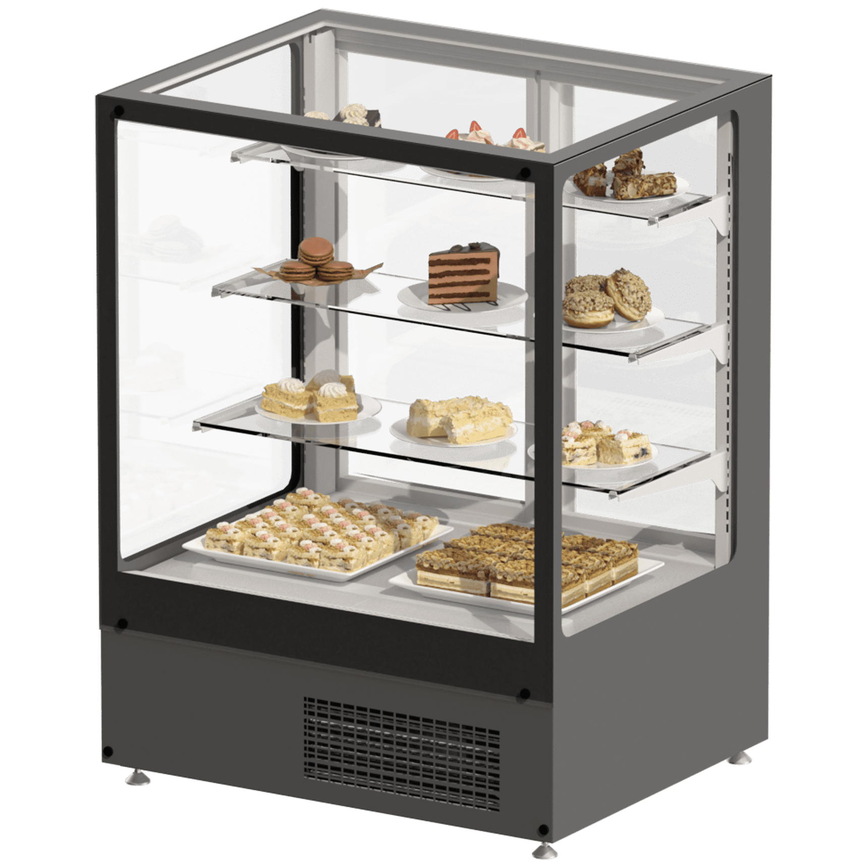 Холодильная горка "РИО 1000" кондитерская на встроенном агрегате применяется в сфере общепита и торговли для демонстрации и хранения продуктов питания. Энергоэффективна, имеет гибкий дизайн и конструкцию и работает при температуре +25°С, влажности воздуха 60%.