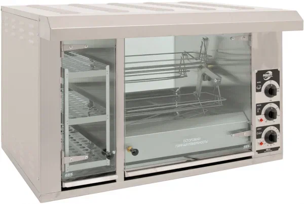 электрический, карусельный, с 4 люльками-корзинами на 8 тушек весом до 2 кг, c 1 стеклянной распашной дверью, электромеханическим управлением, боковой тепловой витриной, из нержавеющей стали