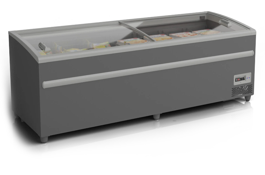 Раздвижные обзорные крышки, внутренняя светодиодная подсветка, два температурных режима -18...-24 ̊С и -2...+6 ̊С, статическое охлаждение, оттайка горячим газом, любой цвет корпуса по каталогу RAL. С обзорными крышками для супермаркетов.