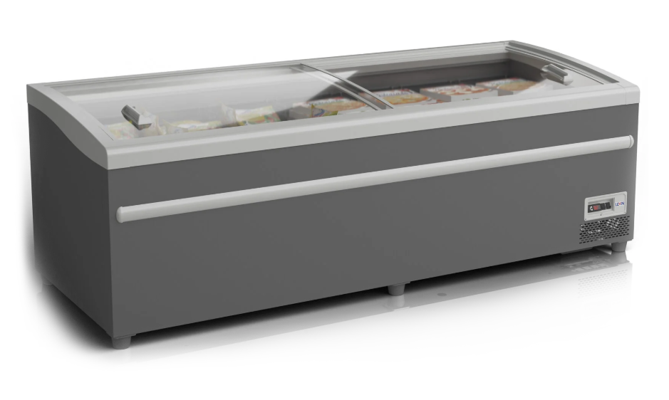 Раздвижные обзорные крышки, внутренняя светодиодная подсветка, два температурных режима -18...-24 ̊С и -2...+6 ̊С, статическое охлаждение, оттайка горячим газом, любой цвет корпуса по каталогу RAL. С увеличенным внутренним объемом для гипермаркетов.