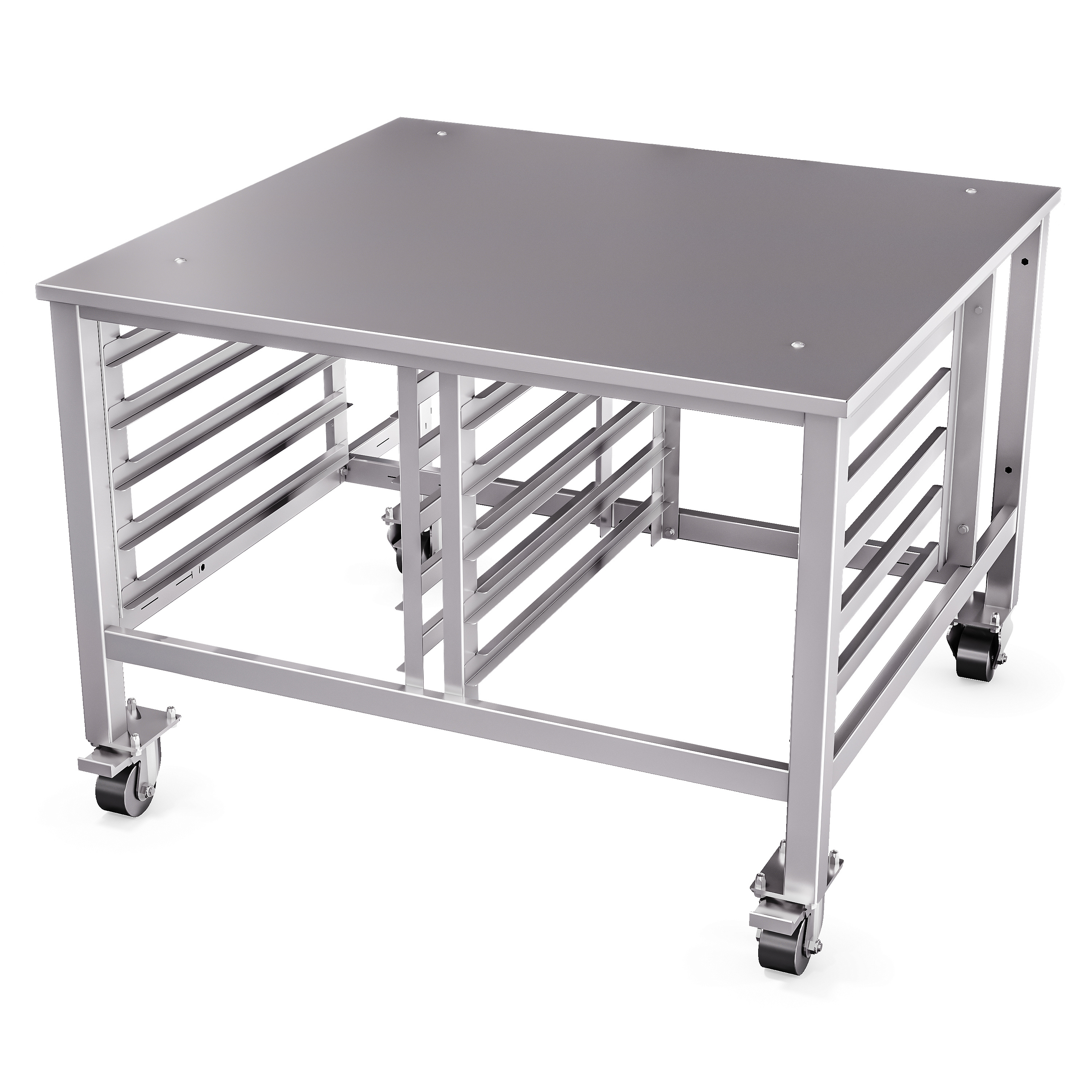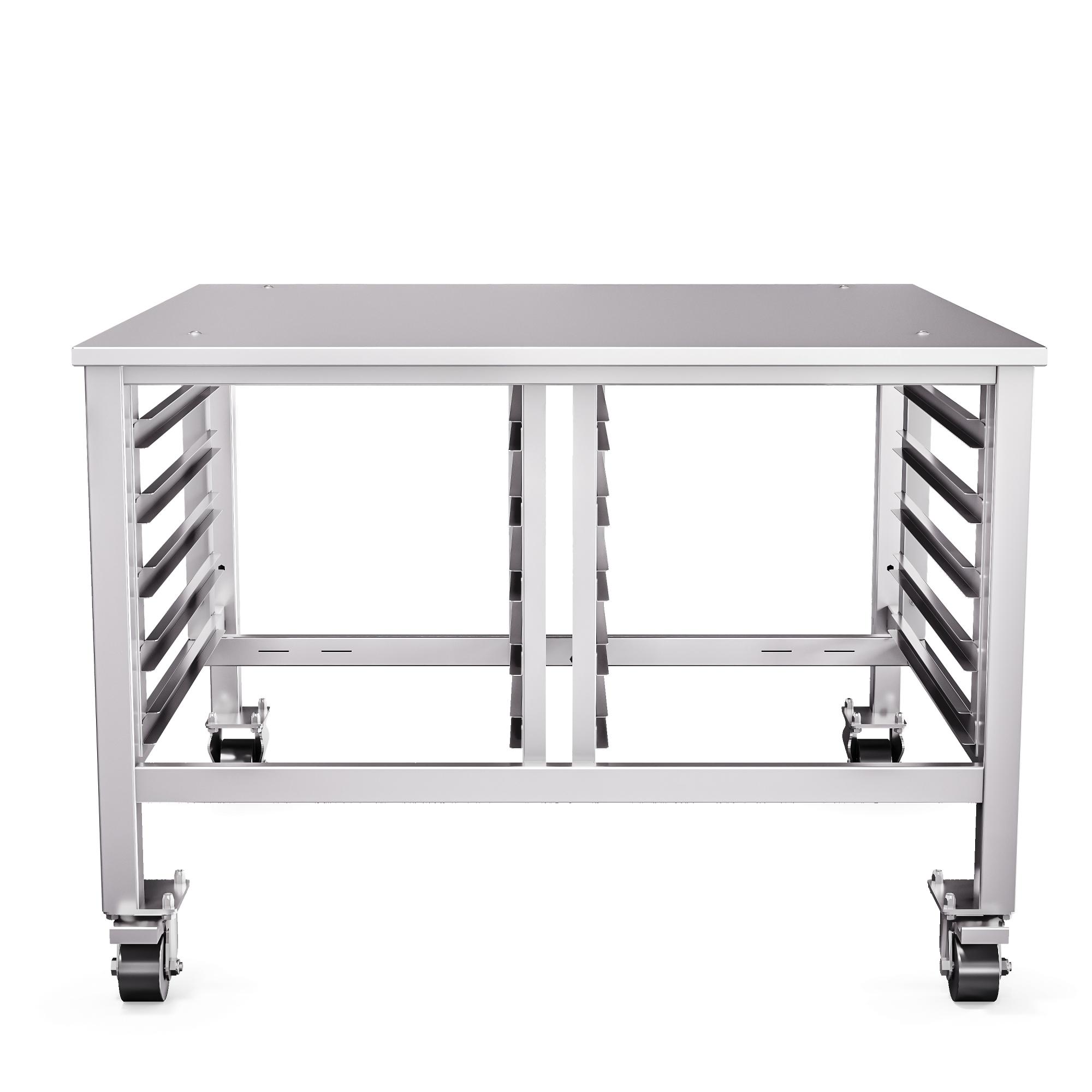 Подставка ПК-10-6/4К предназначена для установки ротационного пекарского шкафа РПШ-10-6/4П на столешницу и размещения десяти гастроемкостей (противней) 600х400 мм на держателях полок.