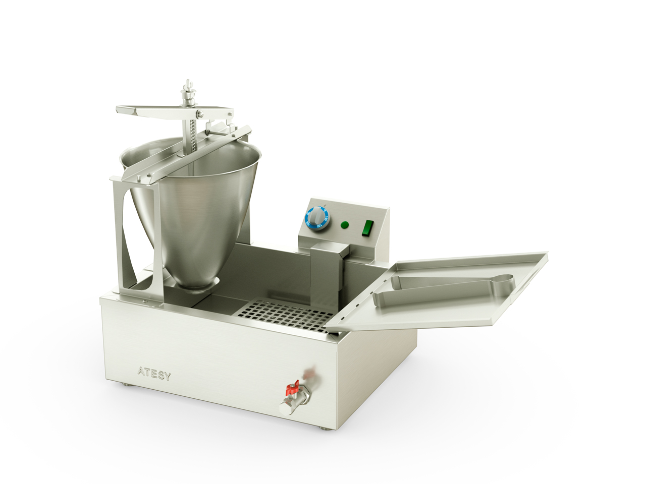 Дозатор пончиков изготовлен из пищевой нержавеющей стали, легко разбирается и моется в посудомоечной машине. Он имеет оригинальную конструкцию, запатентованную компанией АТЕСИ, и способен формировать пончики правильной формы и одинаковой массы из теста любой консистенции.