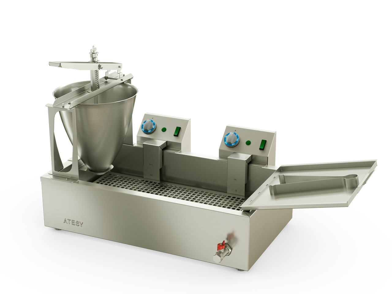 После обжарки готовые пончики выкладывают на специальный поддон, установленный на борту ванны. Отверстия в поддоне позволяют излишкам масла стекать обратно в ванну, что обеспечивает существенное снижение расхода масла. Дозатор пончиков изготовлен из пищевой нержавеющей стали, легко разбирается и моется в посудомоечной машине. Он имеет оригинальную конструкцию, запатентованную компанией «АТЕСИ», и способен формировать пончики правильной формы и одинаковой массы из теста любой консистенции.
