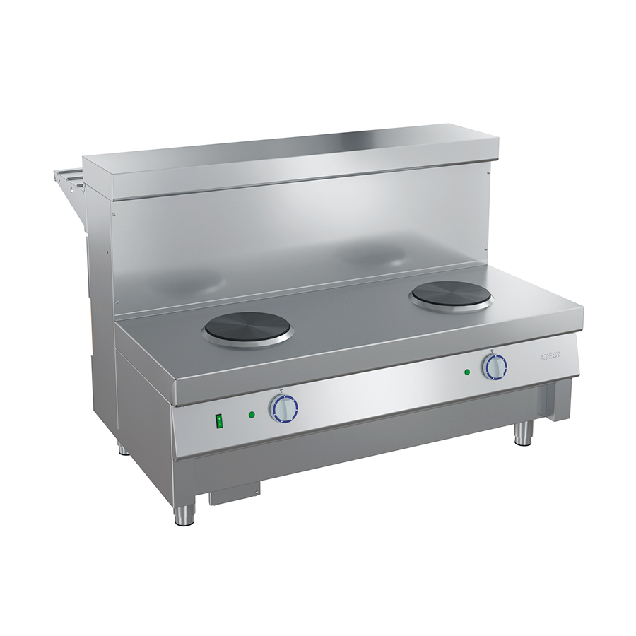 Конструкция сборная, бескаркасная. Высота столешницы с конфорками – 510 мм от уровня пола. Столешница выполнена из нержавеющей стали AISI430. На столешнице расположены конфорки диаметром 220 мм – 2 шт. Мощность каждой конфорки регулируется 6-позиционным пакетным переключателем. Ножки модуля выполнены из нержавеющей стали, имеют пластиковую опорную часть и регулируют высоту модуля в пределах ±20 мм.