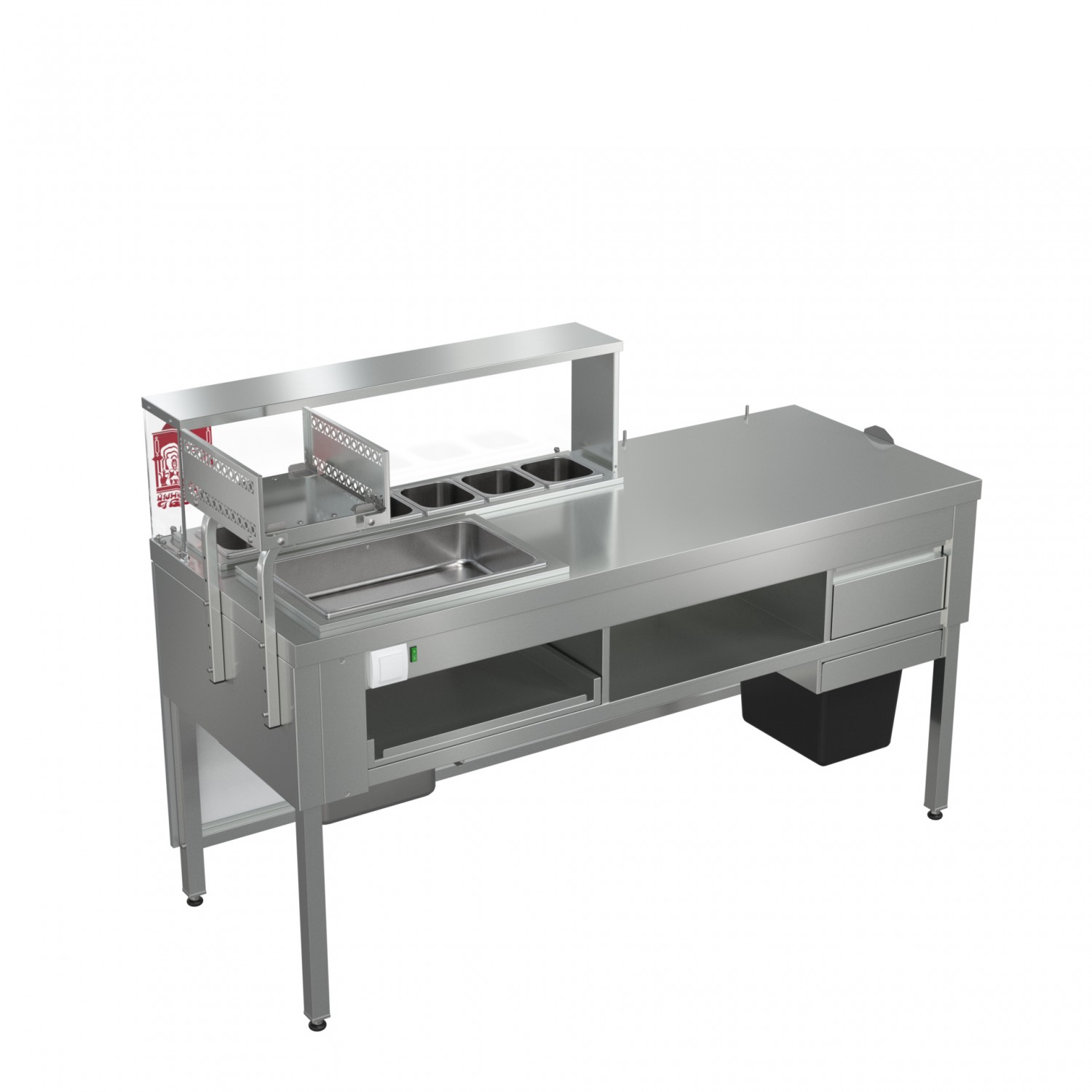 Столешница имеет ограничители, не позволяющие установке сдвинуться со столешницы. С левой стороны станция оборудована полкой, имеющей регулировку по высоте, для установки гриля контактного. Полка имеет ограничители, не позволяющие грилю сдвигаться с полки, а также защитные экраны, защищающие персонал от случайного ожога при контакте с грилем.