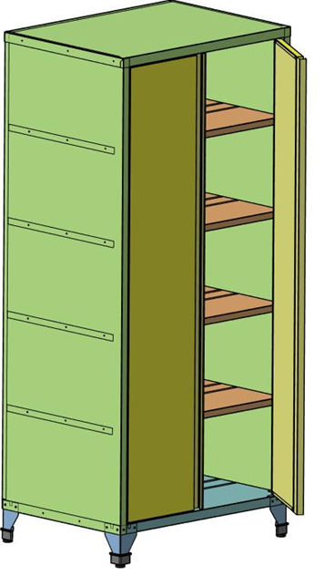 Изготовлен из листового крашеного металла, имеет сварную конструкцию. Стенки шкафа перфорированы, что обеспечивает вентиляцию и сохранность содержимого.