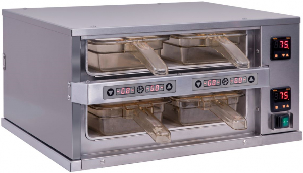 Мультихолдер с электронной регулировкой температуры ROBOLABS МН-2-2М-T1 сухого типа, сквозного исполнения оснащен 2 отсеками для 2хGN1/3-65мм каждый (общая вместимость 4хGN1/3-65мм), которые расположены в 2 ряда и 1 колонку