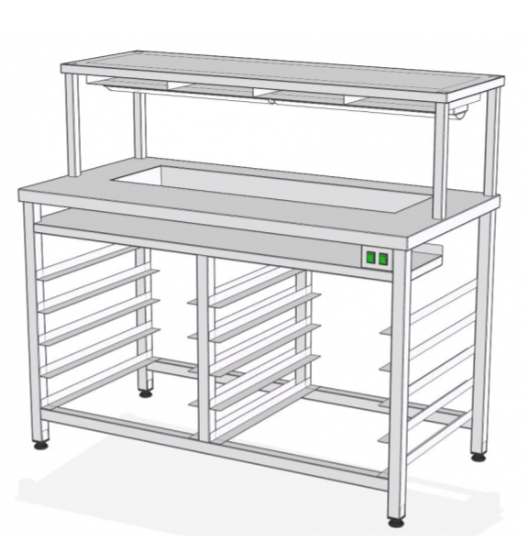Станция для бургеров напольная с нейтральной ванной на 6 GN1/3 глубиной 100 мм и тепловой поверхностью предназначена для фасовки бургеров и других блюд фастфуда. Стол с подсветкой, направляющими под противни 400х600 мм. Гастроемкости в комплект не входят.