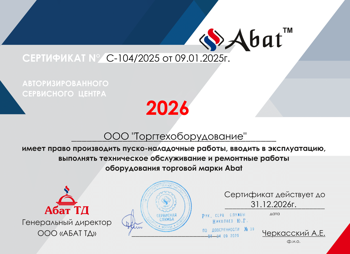 ООО "Торгтехоборудование" имеет право на проведение пуско-наладочных, ремонтных работ, а также гарантийное и после гарантийное обслуживание оборудования, выпускаемого АО "Вяземский машиностроительный завод".